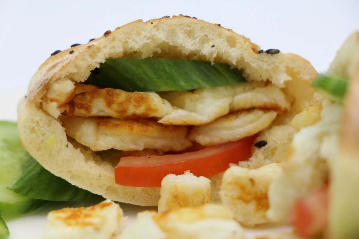 Halloumi cheese wrapped in 25 cm tortilla with fresh vegetables.